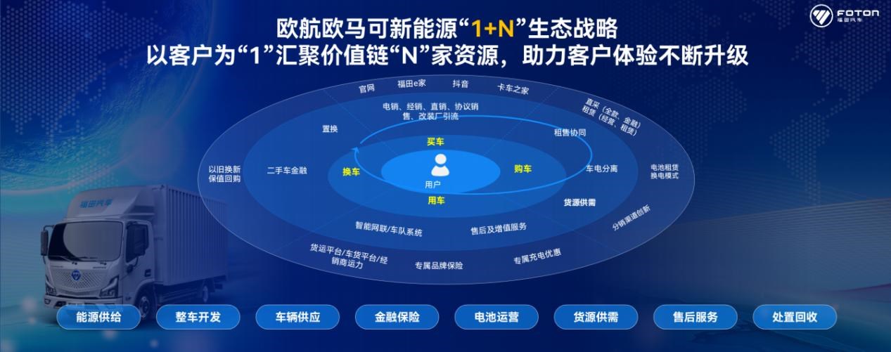 不同于燃油车领域数十年发展积淀,配套成熟,用户更加关注产品本身;对尚处于起步阶段的新能源商用车而言,用户不仅关注车辆本身,购车成本、运营效率、服务便捷等关乎车辆运营的细节更是用户关注的核心。在此背景下,欧马可智蓝秉承以用户为中心的理念,重磅发布全新“1 N”生态战略。其以客户为“1”,汇聚价值链“N”家资源,从能源供给、整车开发、车辆供应、金融保险、电池运营、充换一体、货源供需、售后服务、处置回收等环节,助力用户看车、购车、用车、换车全生命周期价值&体验不断升级。